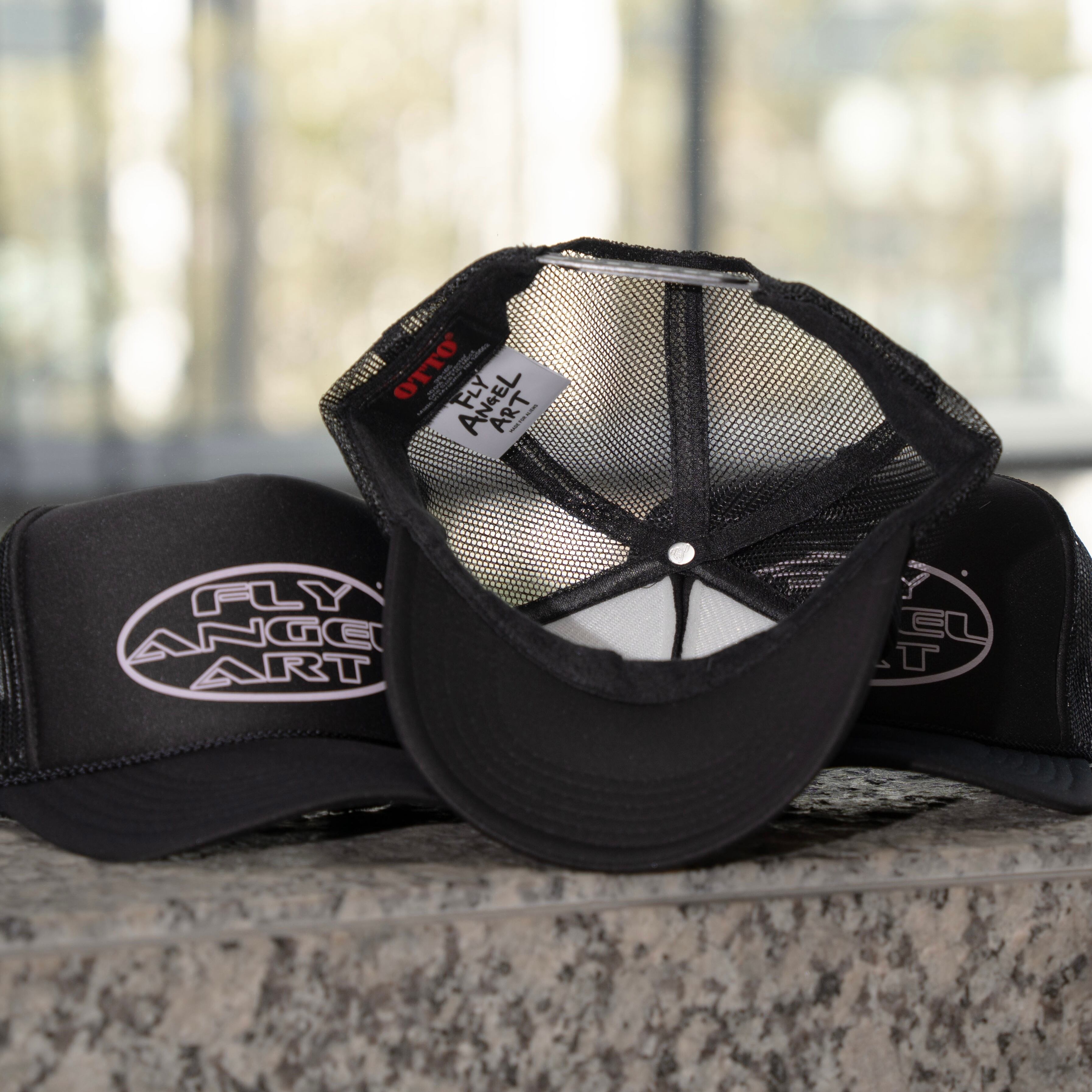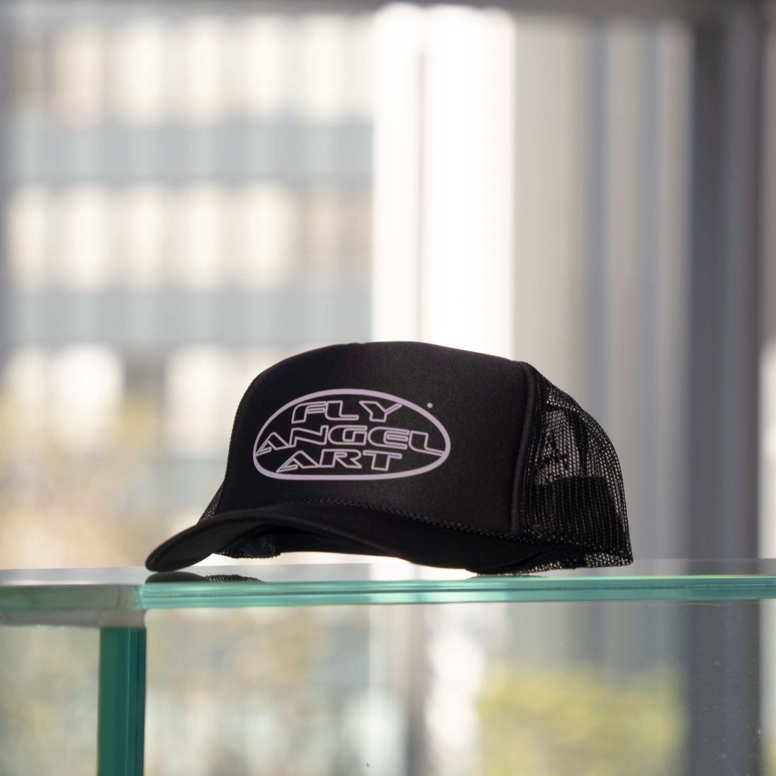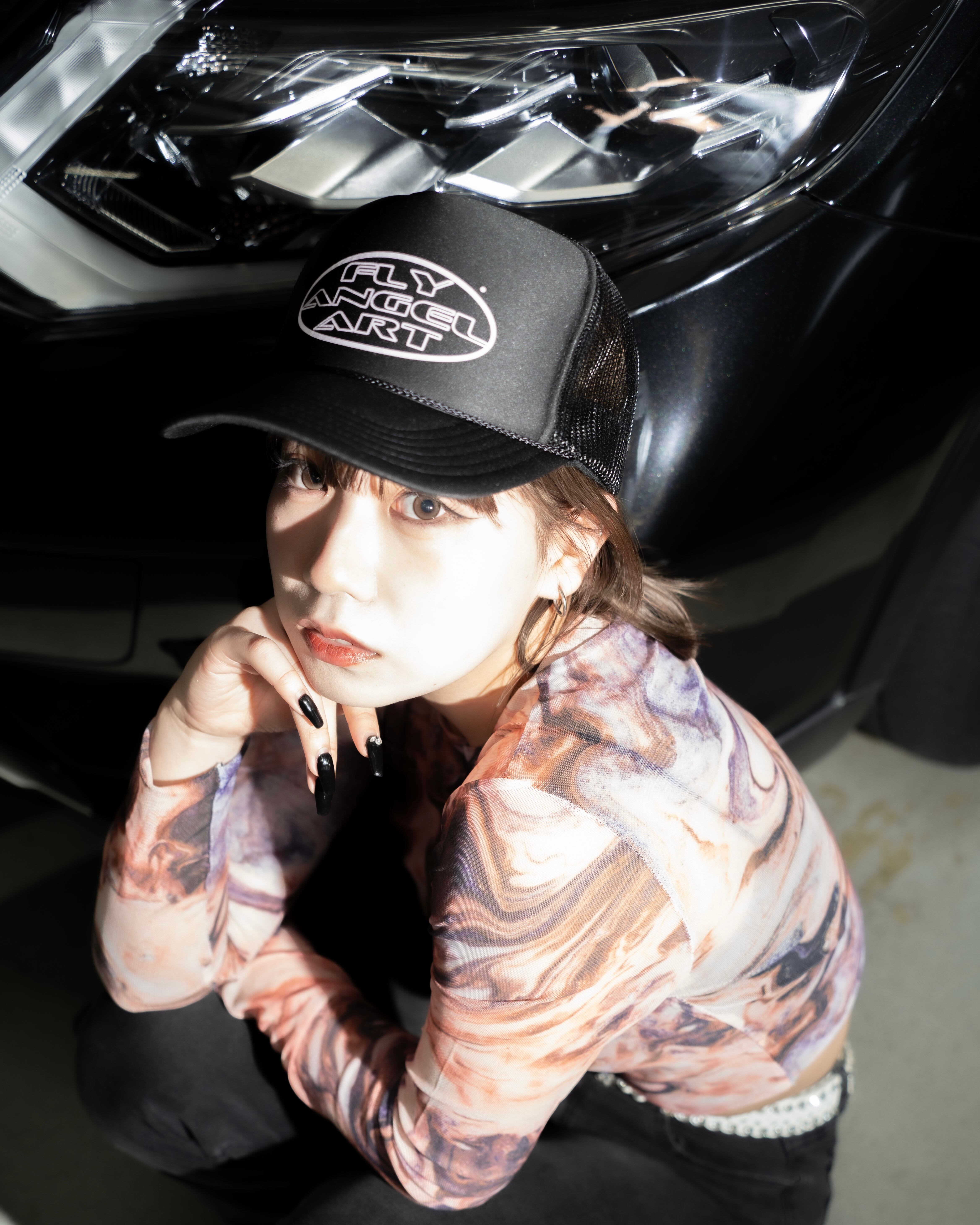フロントにプリントされた"FLY ANGEL ART"ロゴが特徴のトラッカーキャップです。